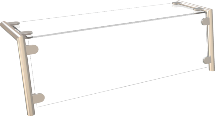 Konzole z trubek pr.34 mm, obě skla kalená, přední tloušťky 6 mm, vrchní 8 mm. Instalace přes závitové tyče skrz pracovní desku. Nad délku 1300 mm je potřeba více konzol.