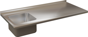 Nerezovou pracovní desku s dřezem tvoří nerez plech tl.1,2 mm podlepený dřevotřískou, která je chráněna zdravotně nezávadným nátěrem. Provedení bez lemů, zadní nebo boční lemy výšky 40 mm. Tl. pracovní desky 40 mm. Umístění dřezu a otvoru pro baterii dle požadavků zákazníka. V tabulce je započítán vevařený lisovaný dřez 400x400x250 mm. Možnost volby velikosti dřezu. Maximální délka desky je 2850 mm.