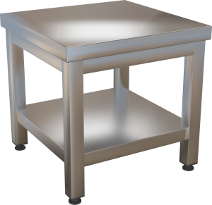 Nerezová stolička s policí. Celonerezové provedení. Pracovní desku tvoří nerez plech podlepený dřevotřískou, která je chráněna zdravotně nezávadným nátěrem. Výšková stavitelnost o 30 mm. Provedení bez lemů, zadní nebo boční lemy výšky 40 mm. Tl. pracovní desky a police 40 mm. Světlost police s podélnými výztuhami 105 mm.