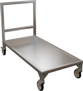Celonerezové provedení. Police tl. 40 mm vyztužené podélnými výztuhami. Nosnost vozíku 100 kg. Madlo na kratší straně. Kolečka pr. 100 mm (2x s brzdou).