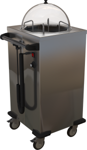 Talířový zásobník se používá k přepravě a předehřívání talířů před výdejem. Celonerezové provedení. Zásobník disponuje topným tělesem a termostatem pro regulaci teploty až do 90°C. Kolečka pr. 100 mm (2x s brzdou). Kapacita 1x 60 talířů, max průměr talířů 320 mm.